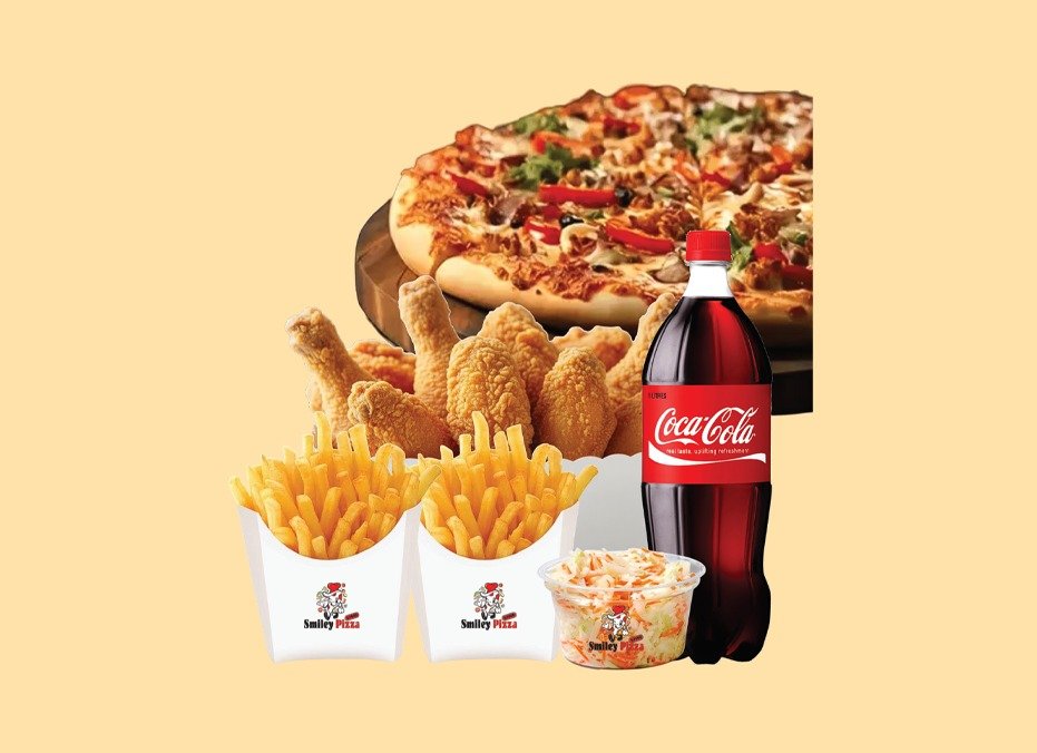 • 1 × Pizza 30 cm (3 toppings of your choice), 6 × Hot Wings, 6 × Crispy Filet Stripes, 1 × Coleslaw Salad, 2 × Fries, 1 × 1L Cola